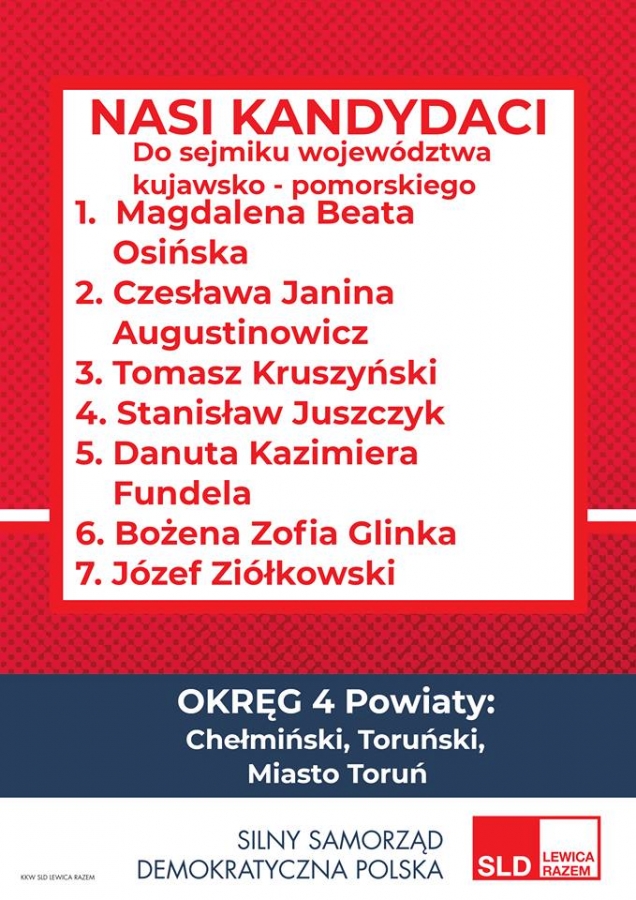 Kandydaci i Kandydatki KKW SLD Lewica Razem do Rady Miasta Torunia